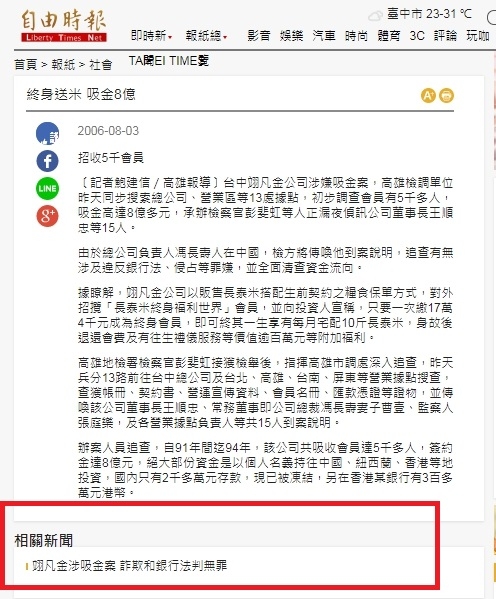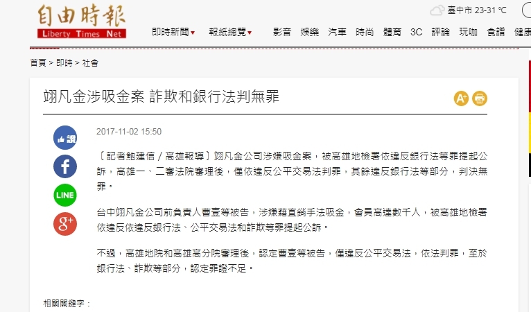 本函於106年11月2日經自由時報從善如流,更正報導「翊凡金涉吸金案 詐欺和銀行法判無罪」,特此感謝相關媒體正視網路霸凌問題!
