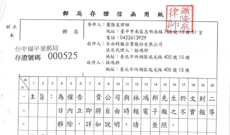 對此本公司於106年10月31日亦委請律師發函催告自由時報企業股份有限公司及林鴻邦,查明事實真相並回覆本公司。