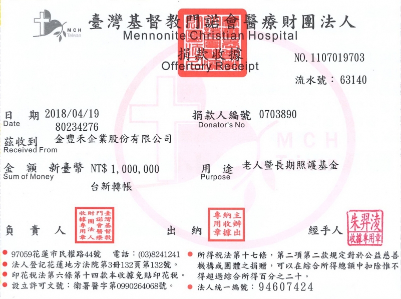 本公司支持並保留予受災最嚴重的花蓮市震災捐款,向花蓮縣府申請退回的原捐款壹佰萬,日前收到當天已直接立即改捐花蓮門諾醫院,並指定老人暨長期照護基金專用。謹此向本公司所有同仁及客戶們報告。