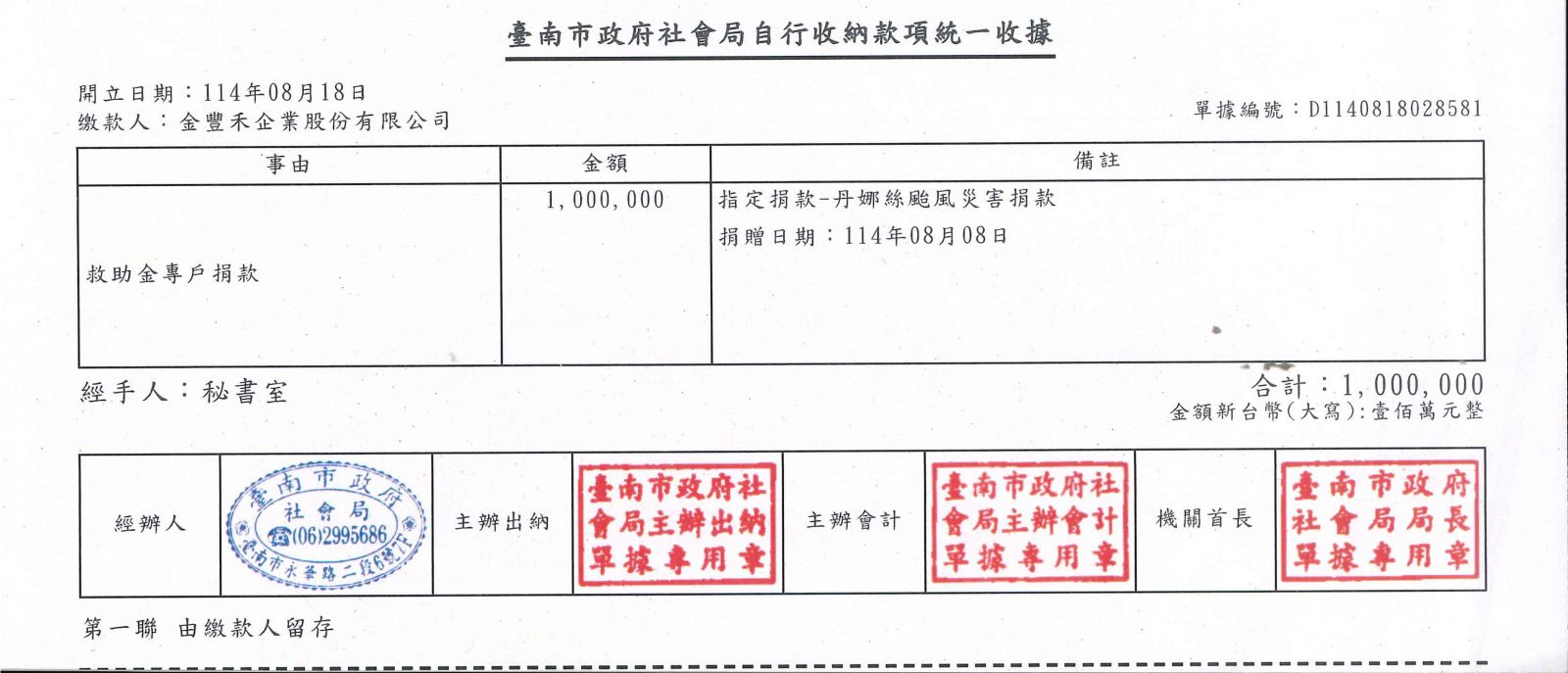 在丹娜絲颱風重創南部之際,金豐禾展開捐款行動,期盼能為受災民眾帶來實質的協助與溫暖。此次捐助不僅是企業責任的展現,更是讓愛化為災後重建的重要力量。