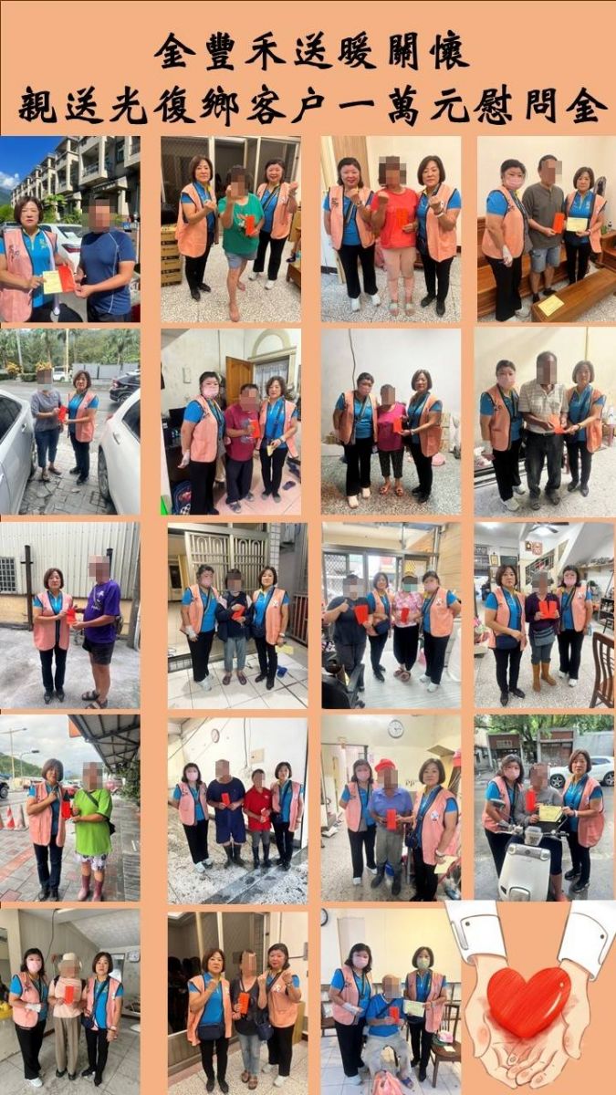 此外,金豐禾也向花蓮光復鄉 24 位客戶致贈每戶新台幣壹萬元慰問金,由當地主管在雙十連假期間親自逐戶送達。
